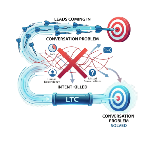 LTC installs a done-for-you conversational AI sales agent that replies instantly, qualifies buyers, and books calls across WhatsApp, Instagram, Facebook, and website chat — 24/7.
